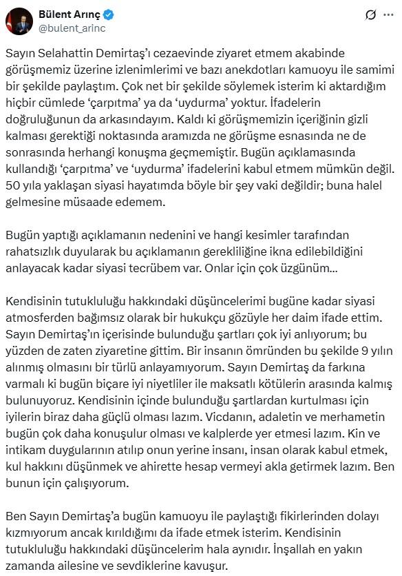 Arınç’ın açıklaması şu şekilde: “Sayın Selahattin Demirtaş’ı cezaevinde ziyaret etmem akabinde görüşmemiz üzerine izlenimlerimi ve bazı anekdotları kamuoyu ile samimi bir şekilde paylaştım. Çok net bir şekilde söylemek isterim ki aktardığım hiçbir cümlede ‘çarpıtma’ ya da ‘uydurma’ yoktur. İfadelerin doğruluğunun da arkasındayım. Kaldı ki görüşmemizin içeriğinin gizli kalması gerektiği noktasında aramızda ne görüşme esnasında ne de sonrasında herhangi konuşma geçmemiştir. Bugün açıklamasında kullandığı ‘çarpıtma’ ve ‘uydurma’ ifadelerini kabul etmem mümkün değil. 50 yıla yaklaşan siyasi hayatımda böyle bir şey vaki değildir; buna halel gelmesine müsaade edemem.