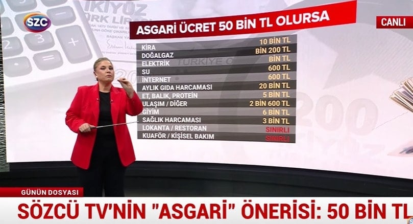 “SÖZCÜ Televizyonu Asgari Ücret teklifi veriyor. SÖZCÜ’nün asgari ücret önerisi 50 Bin lira. Çünkü onurlu bir yaşam için bu gerekiyor”