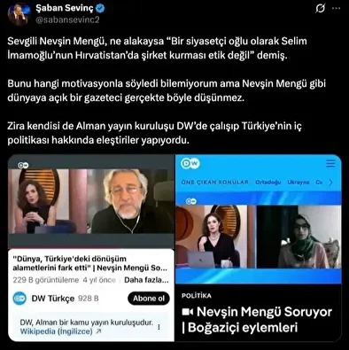 “Sevgili Nevşin Mengü, ne alakaysa ‘Bir siyasetçi oğlu olarak Selim İmamoğlu’nun Hırvatistan’da şirket kurması etik değil’ demiş. Bunu hangi motivasyonla söyledi bilemiyorum ama Nevşin Mengü gibi dünyaya açık bir gazeteci gerçekte böyle düşünmez. Zira kendisi de Alman yayın kuruluşu DW’de çalışıp Türkiye’nin iç politikası hakkında eleştiriler yapıyordu.”