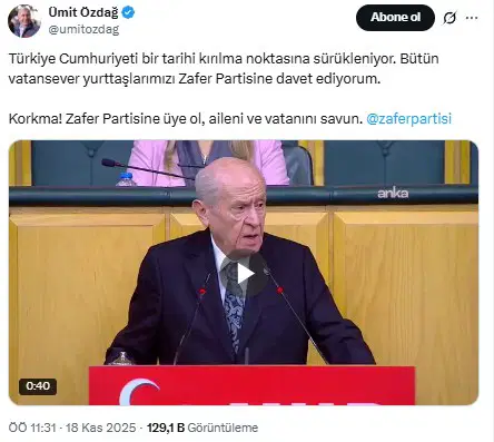 “Türkiye Cumhuriyeti bir tarihi kırılma noktasına sürükleniyor. Bütün vatansever yurttaşlarımızı Zafer Partisi’ne davet ediyorum. Korkma! Zafer Partisi’ne üye ol, aileni ve vatanını savun.”