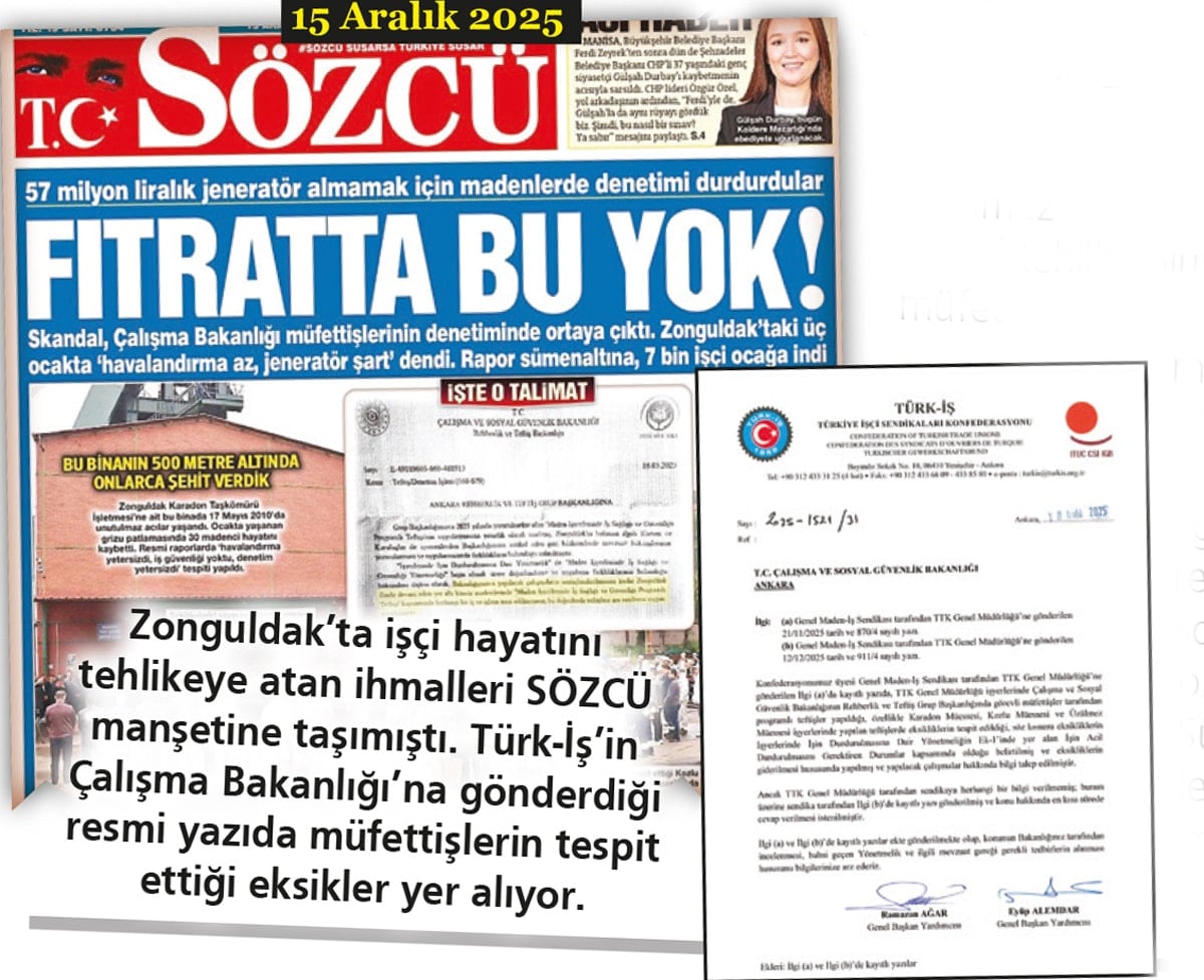 SÖZCÜ, Zonguldak’ta devlete ait Karadon, Kozlu ve Üzülmez maden ocaklarında hayati tehlike oluştuğuna ilişkin müfettiş raporlarına Çalışma Bakanlığı Rehberlik ve Teftiş Başkanlığı tarafından resmi yazıyla son verildiğini ortaya çıkardı. Sümenaltı edilen raporlarda madenlerde işçi hayatını tehlikeye düşürecek nitelikte 5 hayati ihmal olduğunu da gündeme getiren SÖZCÜ’nün haberleri Türk-İş’i harekete geçirdi.